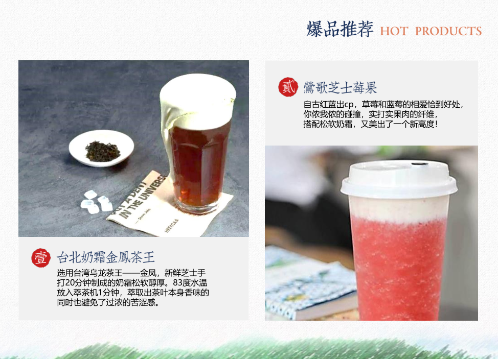 知茶方制茶,呈茶香亦求新生。臺灣高山族茶——茶浪嘿忠于中國傳統(tǒng)茶道,專注呈現(xiàn)高山茶香,回歸茶葉原本的味道,甄選最優(yōu)質(zhì)的茶葉,采用最精湛的制茶技藝,打造最醇美原生好茶。在此基礎(chǔ)上融入四季果茶、冷泡茶、奶蓋茶等年輕女性喜愛的流行元素,以濃郁香醇口感+健康美味、有顏有料食材+富有時尚品味的品牌形象,打造茶飲新風尚,深得大眾喜歡。